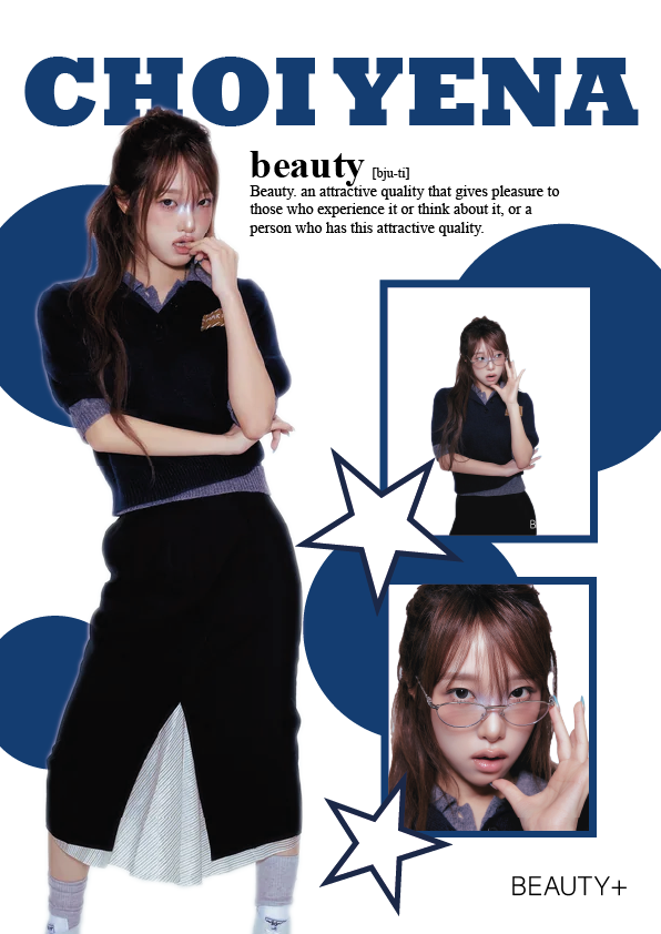 Bij het maken van deze poster heb ik eerst inspiratie opgezocht. Ik zal een leuke poster met stipjes en heb toen gekozen voor foto’s van dit meisje (Yena een k-pop muziek artiest). Ik heb haar foto’s weer vrijstaand gemaakt in photoshop en toegevoegd aan het illustrator bestand. Vervolgens heb ik de rechthoekjes gemaakt en de foto’s in de vlakjes gezet. Daarna heb ik de stippen gemaakt en de kleur uitgekozen, waarmee ik ook haar naam heb geschreven. De foto’s komen van een fotoshoot van een merk ‘BEAUTY+’ dus heb ik de defenitie van het woord beauty erbij gezet om het geheel duidelijker te maken. Als laatste heb ik nog wat leuke sterren toegevoegd waardoor het niet zo leeg lijkt.
