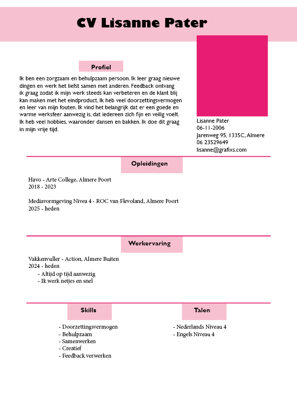 Ik ben een heel vrolijk en creatief persoon. Ik heb heel veel verschillende hobby’s en vind veel leuk om te doen. Mijn favoriete hobby is toch wel dansen. Ik dans al sinds ik 6 ben en ik ben nooit meer een andere sport gaan doen. Ik dans helaas nu een stuk minder dan eerst, maar ik hoop dat ik in de toekomst wel weer meer kan dansen. Films kijken en bakken vind ik ook heel leuk om te doen. Verder word mij altijd vertelt dat ik erg zorgzaam en behulpzaam ben. Ik kan me daar wel in vinden, want ik vind het heel leuk om mensen te kunnen helpen en om voor andere mensen te zorgen.